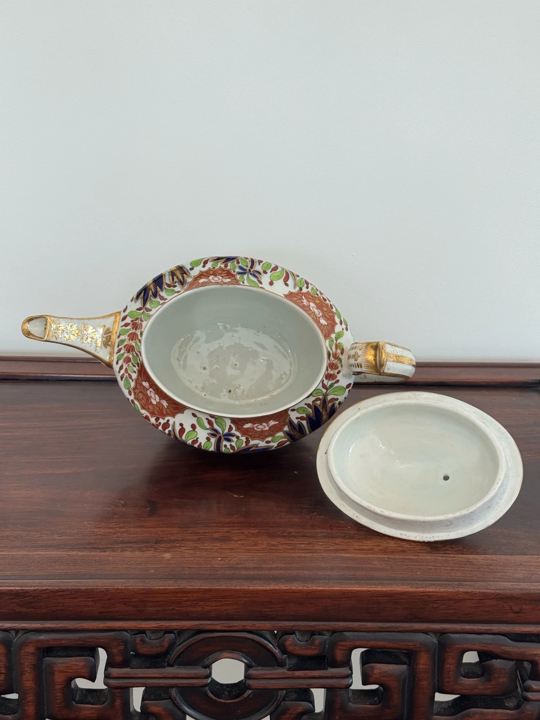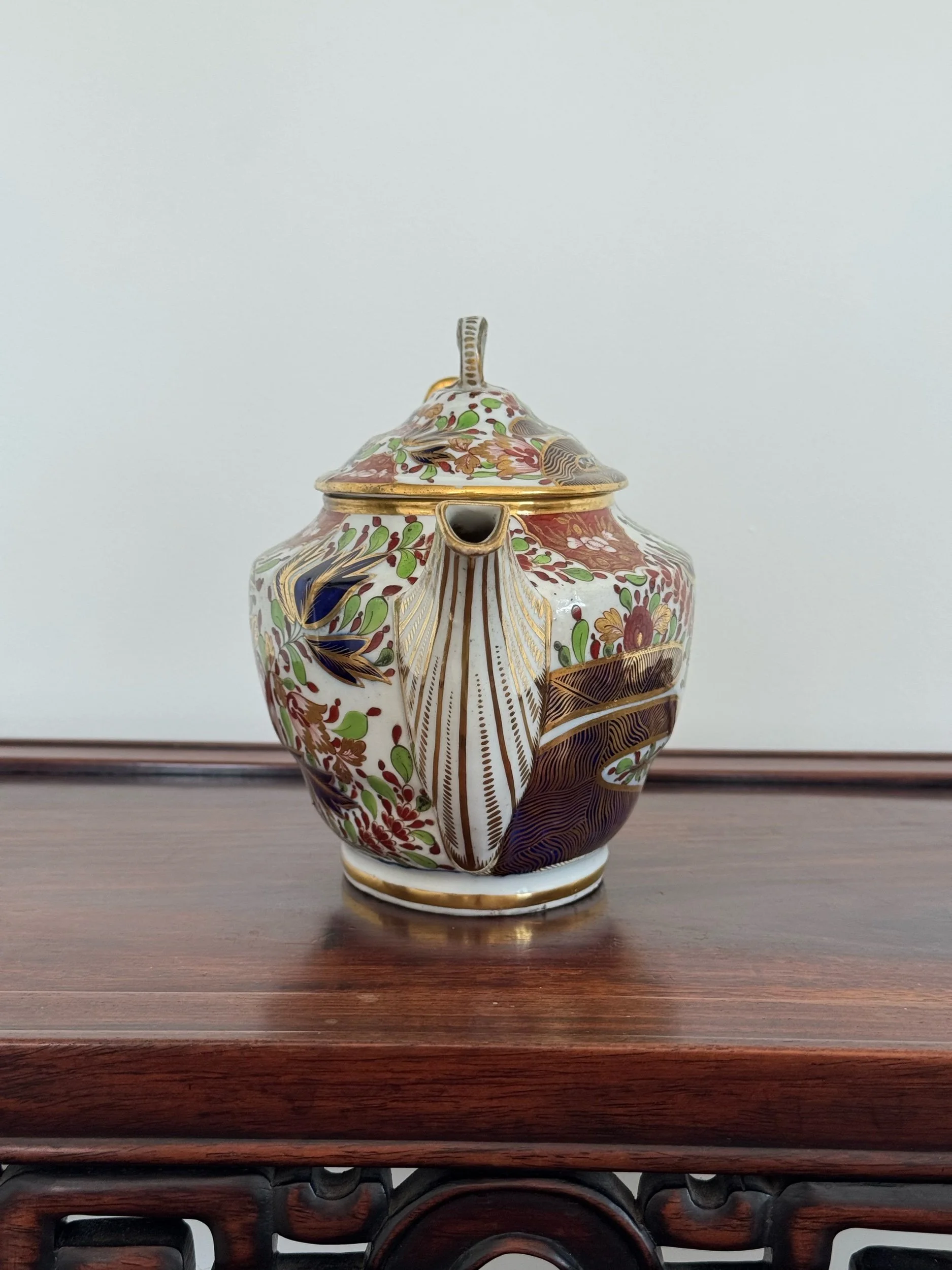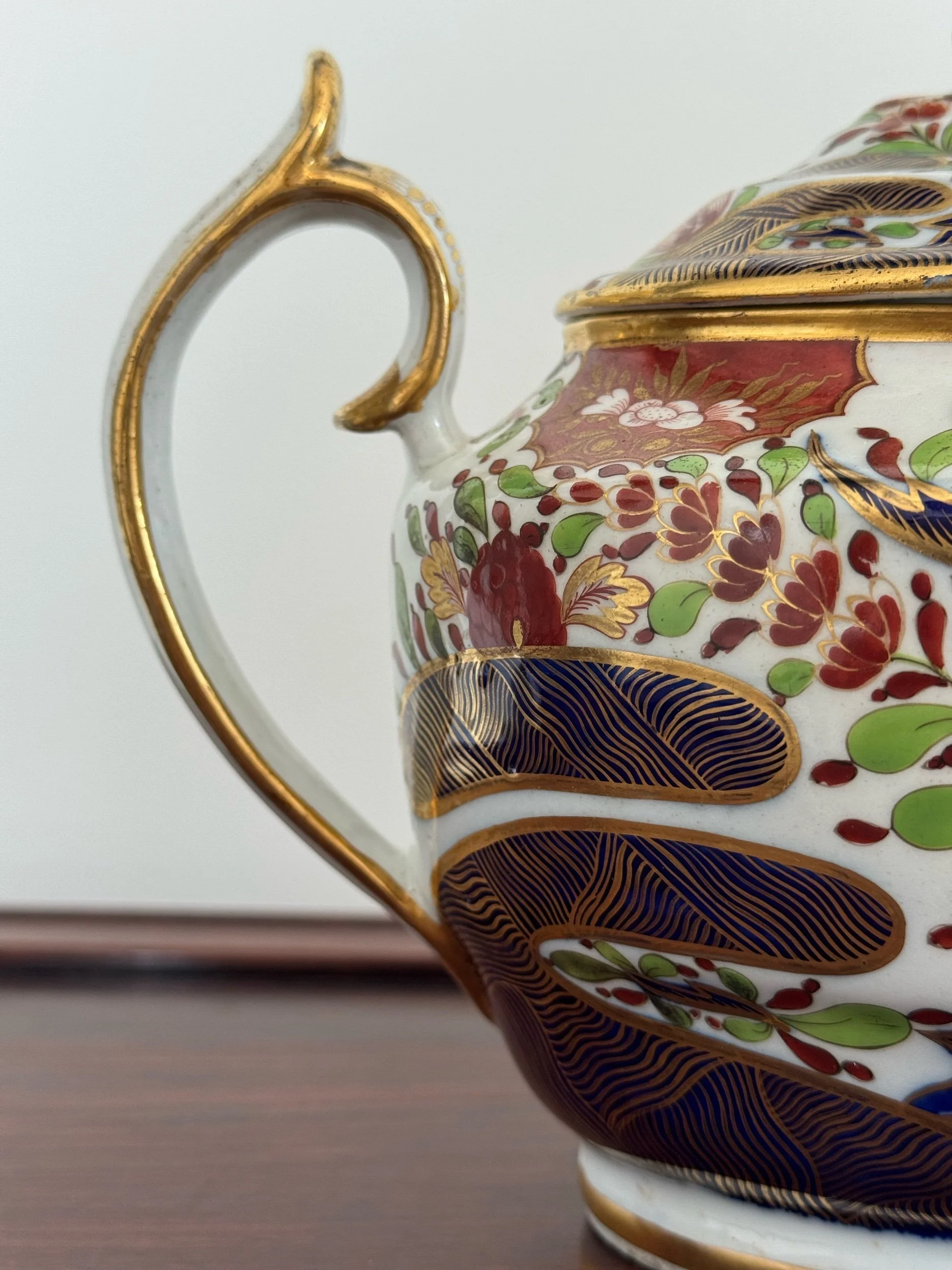 Gorgeous early 19th century porcelain teapot with Imari-style decoration known as ‘Thumb and Finger’ pattern for its distinct blue accents.